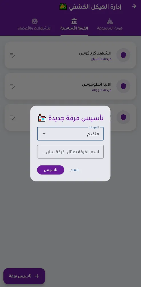 - مثال للتوضيح: عند إنشاء فرقة الأشبال، اكتب الاسم كاملاً: "الشهيد كرياكوس" بدلاً من كلمة "أشبال" فقط.